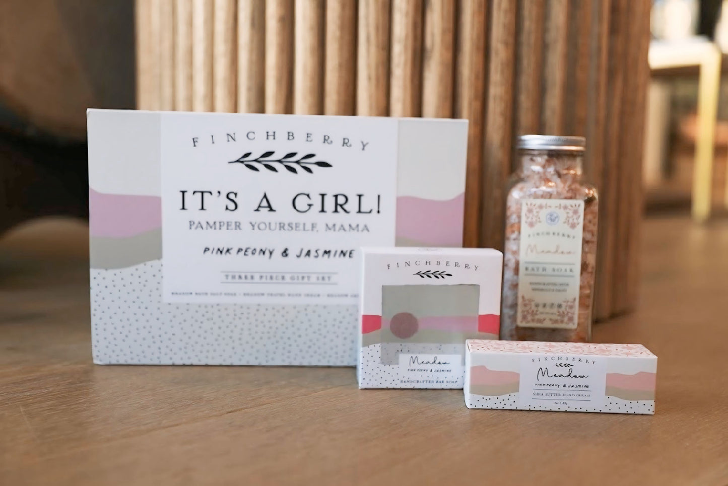 The perfect gift for new mom's. Take a trip to full relaxation from the comfort of your bath with this 3 Piece Gift Set! Meadow combines the flirty and floral scents of Pink Peony and Jasmine with a soothing light pink color scheme to deliver an immersive self care experience. With this 3 Piece Gift Set, a deep, cleansing breath is all you need to transcend your traditional cleansing experience. Each gift set includes a bar of Meadow soap, a bottle of Meadow Salt Soak and a pink loofah. Great gift for baby shower.