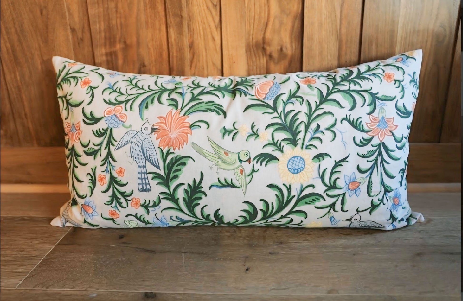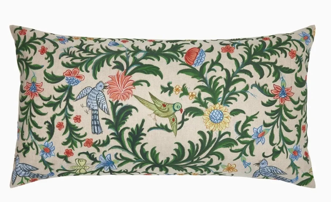 Bright birds, exotic flora and even a cute little dragonfly dance across this hand painted masterpiece. Hand painted on cotton linen. Unbleached natural linen back.